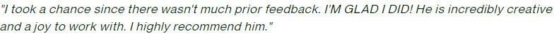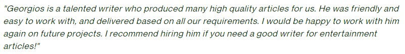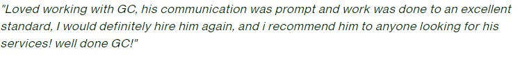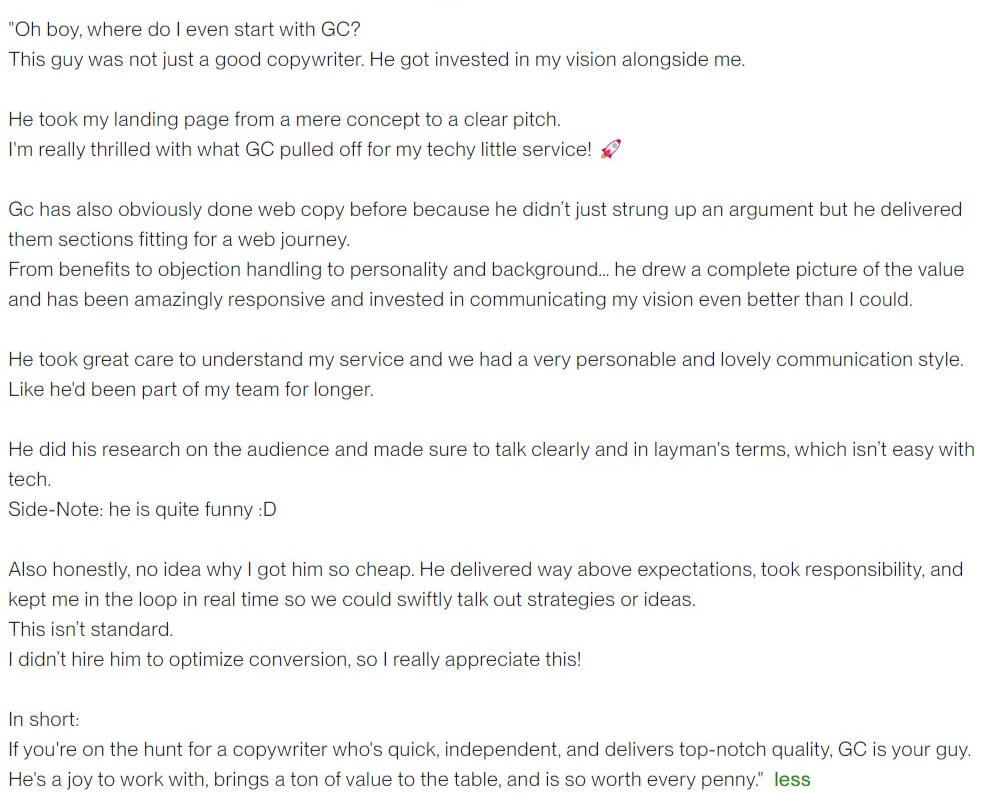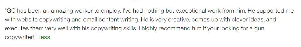 "I've had nothing but exceptional work from [GC]. He supported me with website copywriting and email content writing... ...I highly recommend him if you're looking for a gun copywriter!"