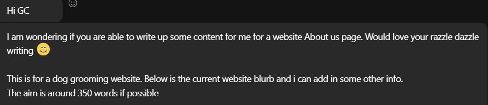 "Are you able to write some content for an About Us page? Would love your razzle dazzle writing"