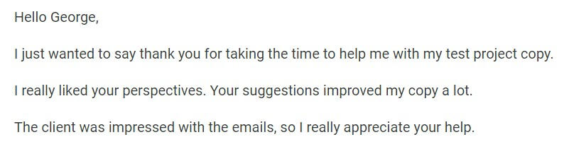 "Your suggestions improved my copy a lot. The client was impressed with the emails"