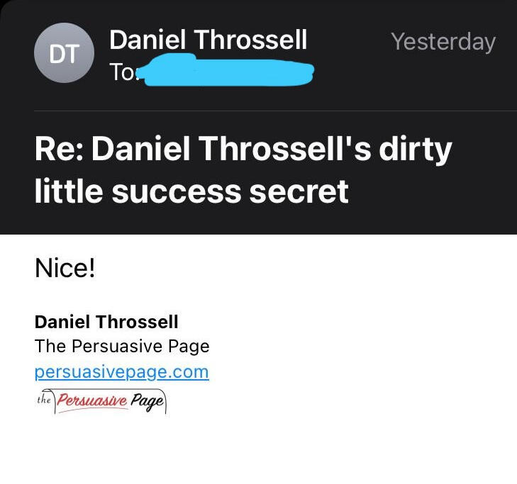 Here's Daniel Throssell, maybe the current king of email copywriting--and potentially Australia's best copywriter--reacting to an email I wrote