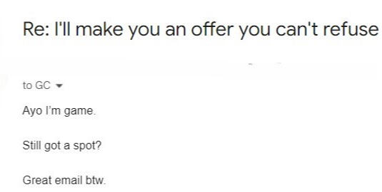 "Ayo I'm game.Stil got a spot?Great email btw"