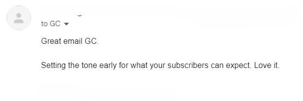 "Great email GC.Setting the tone ealy for what your subscribers can expect. Love it."