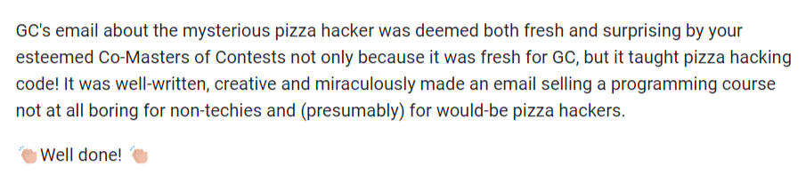 "It was well-written, creative, and miraculously made an email selling a programming course not at all boring for non-techies and (presumably) for would-be pizza hackers. Well done!👏"