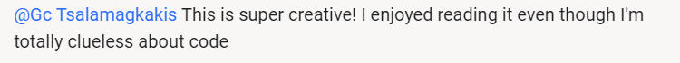 "This is super creative! I enjoyed reading it even though I'm totally clueless about code"(By the way, my emails are not about code, so you don't have to worry about that)