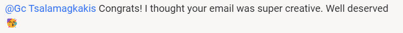"Congrats! I thought your email was super creative. Well deserved 🥳"